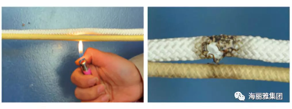 公司研發(fā)的防火逃生繩(黃色)與普通材料逃生繩(白色)防火實驗對比